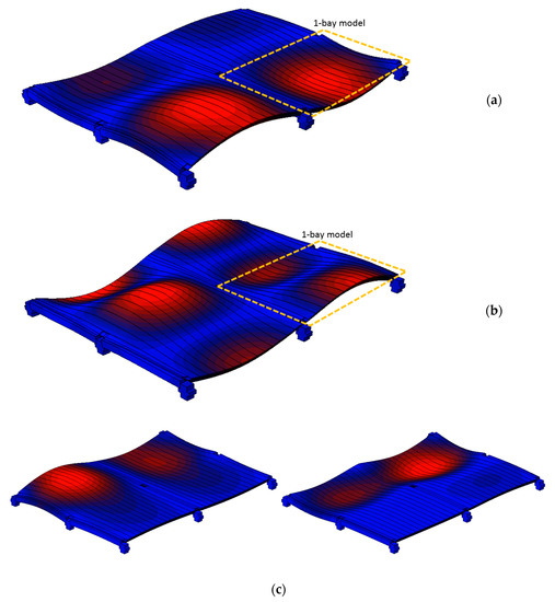 Fundamental natural vibration modes with all the CNC machines at rest (ABAQUS ‘frequency’ analysis, 2 × 2-bay model): (a) f1 = 7.38 Hz, (b) f2 = 9.42 Hz, and (c) intermediate modes.
