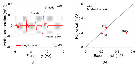 Figure 20b shows the experimental and FE numerical acceleration peaks from the same SSD analysis, as far as the s#4, s#5, and mp#2 control point are taken into account. It is possible to see a rather close correlation of measurements on the side of the floor, while the rigid link-based mechanical system in of Figure 16 tends to underestimate the corresponding experimental measurement, due to the lack of detailing on the side of machinery components.