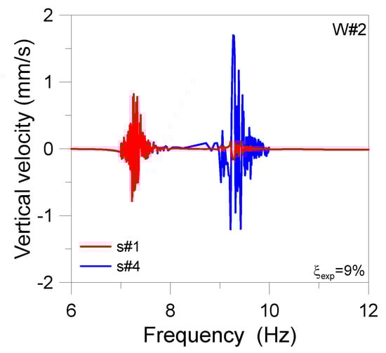Major FE outcomes and selected SSD results are proposed in Figure 20 and Figure 21. More in detail, the estimated SSD acceleration an velocity of the floor are shown in Figure 20 as a function of the frequency of the system, with a focus on the s#1 and s#4 numerical estimates, compared to the s#4 experimental peak (Table 4). The confirmation that the structure suffers for marked resonance issues in the w#4 setup is worth noting, as it can be noticed in Figure 20a for the range of the examined f1−f2 natural frequencies. Moreover, the s#4 control point and the second mode of vibration of the structure were usually found to be associated with more pronounced dynamic effects (i.e., acceleration peaks), compared to the central s#1 point, as an effect of the machine-induced vibrations and the related torsional deformations of the deck.