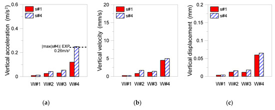 SSD analysis of the inter-story floor region with the working OKUMA (ABAQUS, one-bay FE model): (a) vertical acceleration, (b) velocity, and (c) displacement peaks in the s#1 and s#4 control points. Experimental configuration (synthetized signal, experimental dynamic MoE for concrete and experimental damping ξexp = 9%).