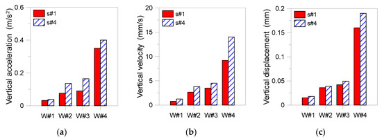 Compared to the mp#2 records on the machinery frame, for example, a rather good correlation was generally found with the content of the s#5 and s#4 records on the slab, as also expected due to the presence of rigid foundation restraints. Figure 14, however, shows the progressive increase of the measured PSD magnitude for the W#4 program, as far as the sensors’ location moves from the OKUMA center towards the mid-span region of the floor. The low natural frequencies in this case are even more pronounced than in Figure 13, due to the imposed vibrations. As far as the OKUMA machine operates as in W#4, compared to W#0, more pronounced resonance effects can be perceived in the form of a ×100 PSD amplitude increase for the records in Figure 14, compared to Figure 13b.