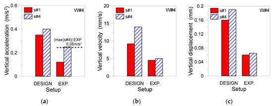 SSD analysis of the inter-story floor region with the working OKUMA (ABAQUS, one-bay FE model): (a) vertical acceleration, (b) velocity, and (c) displacement peaks in the s#1 and s#4 control points. Design configuration, with synthetized signal, nominal dynamic MoE for concrete and conventional damping ξ = 3%).