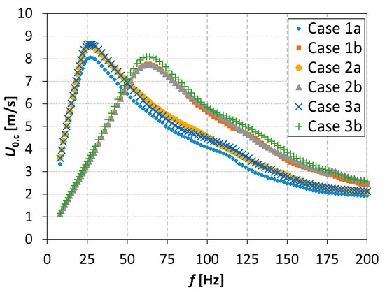 In Figure 4, the centerline momentum velocity as a function of frequency is presented. The results are similar to those obtained with impedance measurements and particularly the values of the characteristic frequencies are the same. The highest velocity values were measured in the case 3: U0.c = 8.64 m/s at f = 28 Hz for the loudspeaker “a” and U0.c = 8.1 m/s at f = 64 Hz for the loudspeaker “b”. The lowest velocity was recorded for the enclosure 1. It may be inferred that fins obstruct the air flow in the actuator cavity by throttling it. This effect is more pronounced in the case of classic (rectangular) fins and less evident in the case of pin fins.