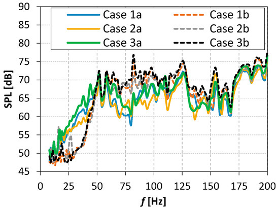 The type of the actuator’s enclosure design has also some impact on the SPL. At the characteristic frequency, the lowest values of SPL were obtained for the cases 2a (f = 28 Hz) and 2b (f = 64 Hz). The highest SPL values were obtained for the cases 3a and 3b in the whole frequency range.