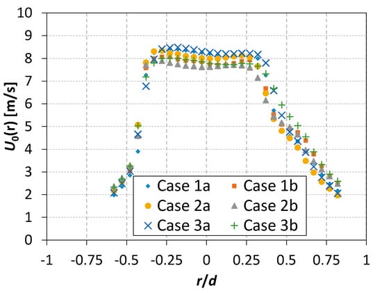 In Figure 6, the momentum velocity profiles are presented. The measurements were taken along the vertical axis of the orifice (according to the setting of the SJA presented in Figure 2). These profiles were used to calculate the characteristic velocity (Equation (2)) and the efficiency (Equation (5)). It may be observed that the velocity profiles are slightly asymmetrical. This asymmetry may result from the geometry of the presented synthetic jet actuator cavity, for example, the presence of the bottom of the cavity and/or fins. In the case of investigated actuators, the ratio of the orifice thickness to the diameter was t/d = 0.4.