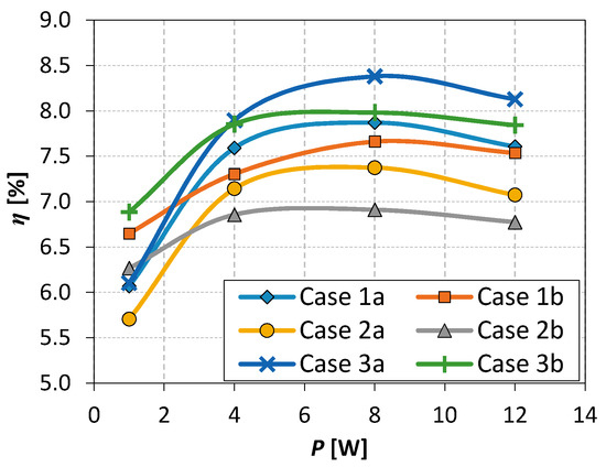 In Figure 7, the SJA energetic efficiency is presented as a function of power. The measurements were carried out for the resonant frequency of the SJA. The highest values of the efficiency were obtained for the enclosures without fins which corresponds to cases 3a and 3b. For a given enclosure type, higher efficiencies were always observed in the case of a loudspeaker with lower resonant frequency (type “a”). The SJA efficiency reflects the throttling effect of the fins inside the actuator’s enclosure. The greatest flow attenuation in terms of U0 occurred for the enclosure with pin fins arranged on the rectangular grid—for the cases 2a and 2b the efficiency was the lowest. Taking the points at P = 8 W as an example, it may be observed that for both loudspeakers the efficiency obtained with regular fins is approximately 11% higher than efficiency obtained with pin fins. The efficiency of the empty enclosure is yet another 10% higher. It indicates that the presence and the shape of the fins in the actuator’s enclosure does not affect the operating parameters of the membrane (or such influence is negligible) but only the flow conditions in the actuator’s enclosure. This is confirmed by the fact that characteristic frequency of SJ is constant for all types of the actuator’s enclosure and depends only on the type of the loudspeaker used.