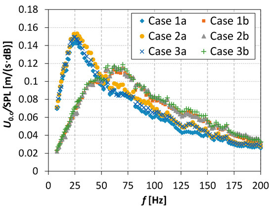 The main scope of the research presented in this paper is the choice of the optimal combination of the loudspeaker and the enclosure design type. For this purpose the ratio of the root-mean-square velocity at the orifice axis to the SPL is plotted as a function of frequency in Figure 9. The ratio of the root-mean-square velocity at the orifice axis to the sound pressure level (U0.c/SPL) ratio was higher for the loudspeaker “a” and did not vary significantly between different enclosure types (with maximum deviation of 0.01 (m/(s·dB))). The type of the loudspeaker used to set the fluid in motion turned out to be more important for the choice of the optimal variant than the fins’ arrangement in the cavity of the actuator. The highest U0.c/SPL ratio was obtained for the case 2a, and this case was chosen as the optimal configuration.