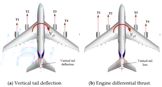 Firstly, it is assumed that the aircraft model has four engines. Considering the complexity of the engine system, the differential thrust input is generated by the two outside engines, which can provide the yaw moment more efficiently because of the longer moment arm. Then, the inside engine thrust is kept the same to maintain the required flying thrust, as shown in Figure 1. The equation is as follows: