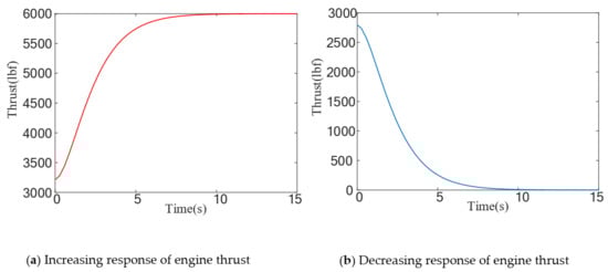 In this paper, the corresponding parameters are based on a JT9D engine. Under the flight condition of Mach 0.8 and 30,000 feet, the engine time constant is 1.6 s and the time delay is 0.6 s. Besides this, the trimmed thrust at this condition is 2789 lbf. The engine increasing and decreasing thrust response is shown in Figure 2. Meanwhile, in the system equipped with the Fast engine response (FastER) system proposed in [30], the time constant and time delay can be reduced by up to 75%.