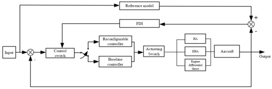 The structure of the designed AFTC method is shown in Figure 3. The baseline controller operates under normal conditions, which are described in a previous work [36,37], and the control is realized by the HA system. When total hydraulic loss occurs, the controller will switch to reconfigurable control law, which is described in [36,37]. Meanwhile, the actuator will switch to the EHA system and launch the engine differential thrust control system, which will operate depending on the situation.
