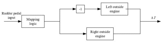 When the vertical stabilizer is completely damaged, the directional control is assumed to be immediately conducted by the engine differential thrust. Therefore, the rudder input should be mapped onto the engine differential thrust input, as shown in Figure 4.