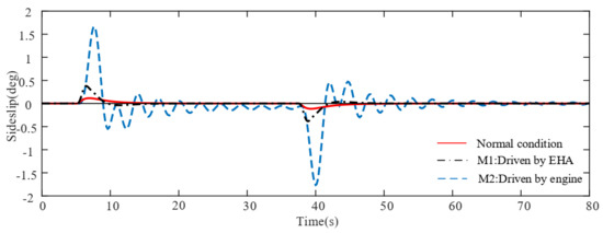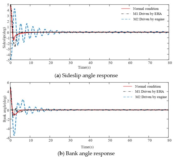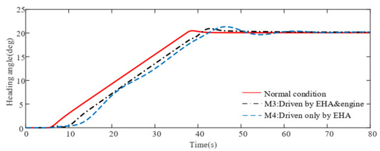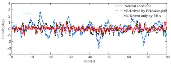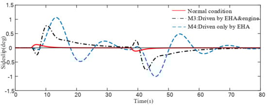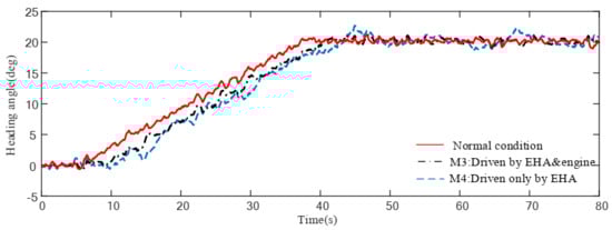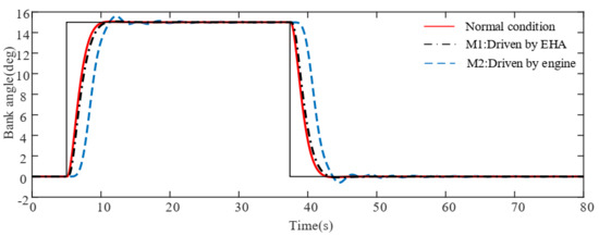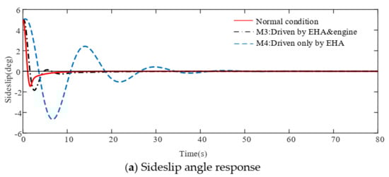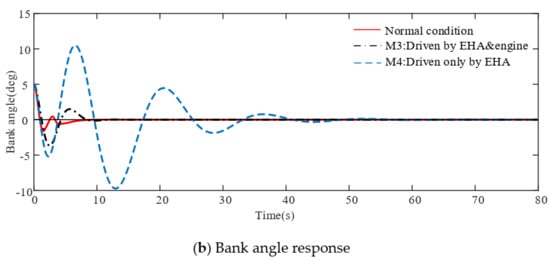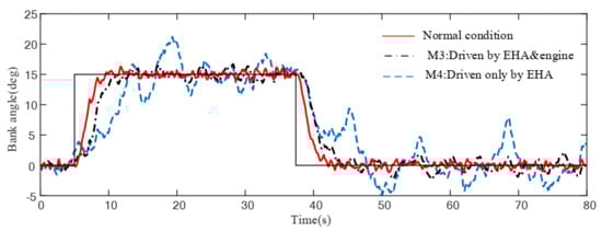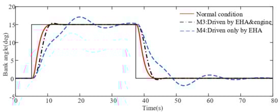 As can be seen from Figure 8, Figure 9 and Figure 10, we still give a step signal of 15 degrees at 5 s and give a turning signal of positive 20 degrees. For the aircraft in scenario II, M3 changes the rudder input into the engine differential thrust input and the system performance is better than the system controlled by M4. With the utilization of differential thrust, the sideslip converges more quickly and the fluctuation amplitude is limited in degrees, which is smaller than degrees when driven only by EHA. Moreover, the bank angle tracks the command well, which has a small overshoot other than oscillation. When driven only by EHA, due to the loss of vertical tail, the damaged aircraft lost its directional stability and its Dutch-roll mode became unstable [31]. Therefore, the sideslip and bank angle are oscillating and struggle to follow the command and the yaw response is seriously delayed for more than 5 s.