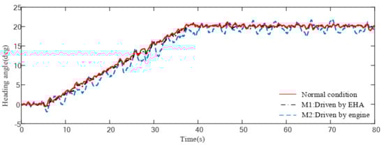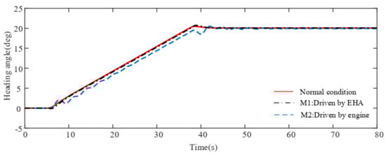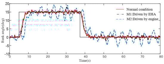 Figure 5, Figure 6 and Figure 7 give the compared responses with sideslip angle, bank angle and heading angle in normal, driven-by-EHA and driven-by-engine conditions for damage scenario I. We give a step signal of 15 degrees at 5 s and give a turning signal of positive 20 degrees. Comparing the simulation results, we can see that the aircraft with THL can be properly controlled by switching the actuation system to the EHA system using the proposed AFTC law. The system performance is very close to normal conditions, with a slightly bigger sideslip and slightly longer raising time. This result demonstrates that there is no necessity of using the engine system in this damage scenario. In Figure 5, we present another simulation result for the traditional aircraft under THL, which is conducted only by engine thrust differential control. It shows a large oscillation in sideslip motion which in turn produces rolling oscillation through the dihedral effect . While it can roughly achieve the flight requirement, it sacrifices the flight quality and requires high proficiency of the crew in a real situation. Such results show the effectiveness of the proposed control law applied on MEA towards scenario I.