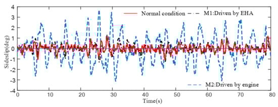 As we can see from Figure 11, it is obvious that M1 performs much better than M2. Compared with normal conditions, M1 has a similar performance to normal conditions, while M2 has a very oscillating response, with the sideslip and bank angle amplitude both up to −5 degrees and converging very slowly. This simulation result shows that the proposed control strategy for scenario I has a higher ability to recover from the undesired attitude.