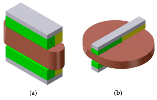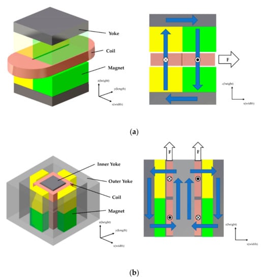 Figure 1a shows the structure of a typical VCM. Two pairs of magnets are arranged on each side of the coil to form a strong magnetic flux in the perpendicular direction (z) to the air gap, and force is generated in the horizontal direction (x) by the current flowing along the coil in the perpendicular direction (y) to the magnetic flux. Thus, we call this type of VCM “horizontal force voice coil motor” (HVCM). Here, a yoke is attached to the upper and lower sides to concentrate the magnetic flux in the air gap. Figure 1b shows the rectangular type axis-symmetric VCM developed by Choi et al. [17], in which four pairs of magnets are arranged in an external yoke, while an internal yoke that is sufficiently thick to prevent magnetic saturation is positioned in the center. Two upper and lower coils are wrapped around the internal yoke. Here, a magnetic flux is formed in the horizontal direction (x and y) in the air gap between the permanent magnet and the center yoke, and force is generated in the vertical direction (z) as the current flows along the coil in the perpendicular direction (y and x) to the magnetic flux. Thus, we call this type of VCM “vertical force voice coil motor” (VVCM). In this research, how to increase the force of the VCM was studied as a measure for overcoming insufficient force, which is the drawback of general VCMs. The force of the VCM is Lorentz force described by Equation (1), and the magnitude of the force is calculated by Equation (2).