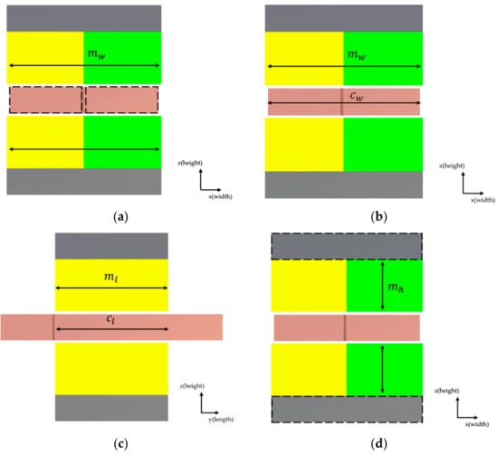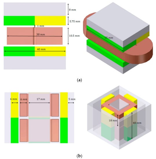 Figure 2 displays the method of changing the HVCM shape parameters as cross-sectional diagrams. Figure 2a–e corresponds to case (a)–(e), as shown in Table 1. Figure 2a,b refers to cases (a) and (b), where the HVCM volume changes in the x-direction, which is the width direction. Thus, the sizes of both magnets and yokes change in the direction perpendicular to the magnetization direction, and the change in the value is indicated by the change in the magnet’s width, as shown in Table 1. The coil’s width increases and decreases at the same rate as the change in the magnet’s width in case (b), whereas the coil’s width is fixed to the nominal size and each coil bundle is moved to be positioned in the center of each magnet in case (a). This is to consider the case of the largest force occurrence because the magnetic flux density by the permanent magnet is strongest in the point aligned with the center of the magnet. Here, if the magnet width is smaller than the nominal value of the coil width, part of the coil is placed outside the magnetic field of the permanent magnet, which does not generate force. Thus, such a case is excluded from the analysis. As a result, only the range in which the magnet width is larger than the coil width is checked in case (a). Figure 2c shows case (c), where the HVCM volume changes in the y-direction, which is the length direction. Thus, the sizes of both magnet and yoke change in the direction perpendicular to the magnetization direction, and the coil is also interlocked, so its length also increases. If the coil’s length is not interlocked, so that the magnet becomes longer than the coil, force is generated in an unintended direction by the round part of both ends of the coil. Conversely, if the magnet is shorter than the coil, part of the coil may not generate force. Figure 2d,e show cases (d) and (e), where the HVCM volume changes in the z-direction, which is the height direction. In case (d), the magnet height increases, and the coil’s height is fixed to the nominal size. On the other hand, in case (e), the coil’s height increases, and the magnet’s height is fixed to the nominal size. Thus, the parts of the magnet or yoke marked with a dotted line move without any changes in size, maintaining the air gap with the coil.