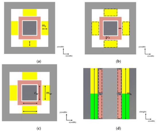 Figure 3 shows the method of changing the VVCM’s shape parameters as cross-sectional diagrams. Figure 3a–e corresponds to case (a)–(e) as shown in Table 2. Figure 3a–c refer to case (a)–(c), where the VVCM volume changes in the x and y directions, that is, the width direction. In contrast with the HVCM, since the VVCM is symmetrical around the z-axis, the volume increases in the x and y directions simultaneously. For case (a), the size of the four pairs of magnets, whereby each pair is located up and down along the inner surface of the external yoke, change in the magnetization direction. That is, the magnet’s thickness changes, which changes the location and size of the external yoke, thereby changing the overall size of the VVCM in the width direction. In contrast, in case (b), the coil’s thickness changes, and the four pairs of magnets move without any change in their size, maintaining the air gap with the coil. Accordingly, the location and size of the external yoke change, thereby changing the overall size of the VVCM in the width direction. Case (c) is a method in which the widths of both magnet and coil change together. Thus, the coil’s total length increases in case (c)m whereas the number of coil turns increases in case (b). Moreover, the size of the magnet changes in the direction perpendicular to the magnetization direction, in contrast with case (a). Accordingly, the location and size of the external yoke change, thereby changing the overall size of the VVCM in the width direction. Figure 3d,e refer to cases (d) and (e), where the VVCM volume changes in the z-direction, which is the height direction. Thus, the dimension of the magnet changes in the height direction perpendicular to the magnetization direction. However, the coil moves to be positioned in the point aligned with the center of each magnet, without any change in size in case (d), and the dimension changes at the same rate as that of the magnet in case (e). Similarly, to the previous case (b) of the HVCM, when the magnet height is smaller than the coil height, part of the coil is not affected by the magnetic field, which was excluded from the analysis.
