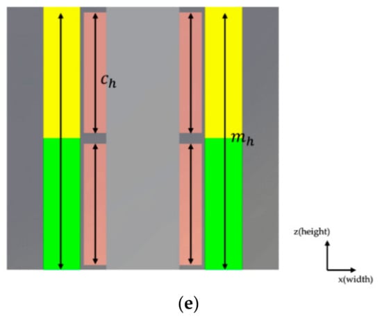 Variations of the vertical force voice coil motor (VVCM)’s structure according to changes in the design parameters: (a) case (a), change of magnet thickness; (b) case (b), change of coil thickness; (c) case (c), change of VCM width; (d) case (d) change of magnet height; (e) case (e) change of VCM height.