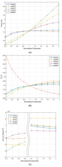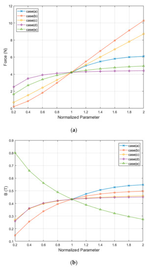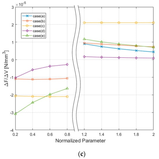 Next, Figure 8c shows force change to volume change regarding the change in the shape parameters. The absolute value of the volume change was used to represent the increase and decrease in force using signs. The force is efficiently increased when the respective size of the coil and magnet increased simultaneously in width direction (case (c)) and height direction (cased (e)). Note that the value of case (c) is higher than the value of case (e), which contrasted with the results of force. This is because the increase in the VVCM’s overall volume according to the increase in the magnet’s width in case (c) was significantly smaller than the increase in the VVCM’s overall volume according to the increase in the magnet’s height in case (e). On the other hand, although case (d), in which only the magnet’s height increased, could obtain an increase in force, the force increase with respect to volume increase was diminished demonstrating significantly low efficiency of the volume increase. Therefore, when designing the VVCM, it is recommended that the height of the magnet is not set larger than necessary compared to the height of the coil. In case (a), a small change of volume affects largely on force change, but its effect rapidly diminishes. As a result, the generated force barely changes as shown in Figure 8a. Thus, selecting the proper thickness of the magnet and coil followed by increasing the VVCM volume in the width and height directions (case (c) and (e)) was found to be effective in increasing the force of the VVCM.