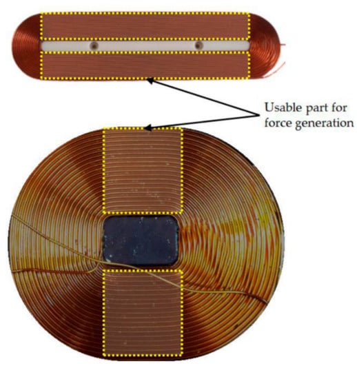 Finally, force change to volume change was presented regarding the change in the shape parameters to verify the efficiency of the increase in the volume for the increase in the force of the HVCM. The absolute value of the volume change was used to represent the increase and decrease in force using signs. As shown in Figure 6c, case (c) is most noticeable. That is, the increase in volume in the lengthwise directions of the magnet and coil is the most efficient method of increasing the force. As Figure 6a verified that the effect of the increase in volume in the height direction (cases (d) and (e)) was limited, Figure 6c also shows that the effect by height increase diminishes according to volume increase. Thus, the height of the coil and magnet is fixed to an appropriate value rather than increasing it, and the volume in the direction perpendicular to the height is desirable in order to increase the force of the HVCM. One more noticeable result is the case (b). When the volume increases in the width direction, the number of coil turns increases, thereby increasing the part of the coil that is not involved in the generation of force (as shown in Figure 7). It can cause distortion of the coil shape overall and generation of Lorentz force in the undesired direction. Thus, it is necessary to maintain a width to length ratio below a certain value. Moreover, the difference between the results of the case (a) and (b) tells that the increase in the widths of the magnet and coil by interlocking them (cases (b)) is more efficient than increasing the width of the magnet only (case (a)). Thus, it is preferable to fix the magnet width to be no larger than necessary to motion compared to the coil width when designing the HVCM.