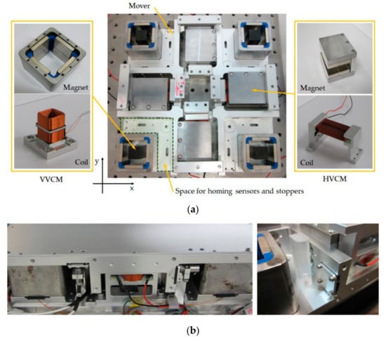 Based on the results of the analysis presented in Section 3, two types of VCMs were designed for a precision maglev precision positioning device. Since a maglev device performs positioning while floating in the air and a VCM generates uni-directional force, for six-DOF motion control, it requires more than 6 VCMs. In this paper, eight VCMs were arranged as shown in Figure 9a by considering the symmetry. VCMs for a vertical motion were arranged at the four vertices, and VCMs for a horizontal motion were arranged along the four edges. Utilizing the VCMs at vertices, the maglev positioning device can achieve the out-of-plane motion, that is, motion in the z, θx, and θy directions. Similarly, utilizing the VCMs at edges, the maglev positioning device can achieve the in-plane motion, that is, motion in the x, y, and θz directions. In the maglev device, not only a space for VCMs but also a space in which to arrange the displacement sensor and the mechanical stopper for homing was also needed, as shown in Figure 9a,b. The mover of the maglev positioning device has a size of 250 mm × 250 mm × 40 mm. Accordingly, the given space for VCMs is limited as presented in Table 4. Because of this space arrangement and assembly, a type of VVCM that was suitable to be increased in the vertical direction was selected for a vertical motion, while a type of HVCM that was suitable to increase in the length direction was selected for a horizontal motion.