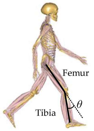 Illustration of the movement of knee joint. The angle is defined as flexion between the femur and the tibia in sagittal plane.