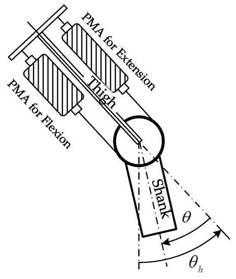 The knee joint, i.e., the flexion and extension movement, is powered by two antagonistic PMAs. The two PMs actuate the rotational knee joint via 3mm diameter steel cables with a 30-mm moment arm. Each PMA is connected to the structure basis through a force sensor to detect the real-time force information. An angular encoder is mounted along the joint axis to measure the angular position of the knee joint. The brief schematic drawing of the mechanism is illustrated in Figure 2. The knee joint is set to be zero when the center lines of thigh and shank segments coincide and increases as the joint flexes.