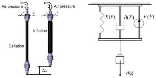where M is the mass of PMA, g is the acceleration of gravity, P represents the input pressure, x = 0 corresponds to the fully deflated position of PMA, and K(P) and B(P) are pressure-dependent coefficients representing the spring and damping elements respectively, which can be determined experimentally.
