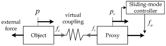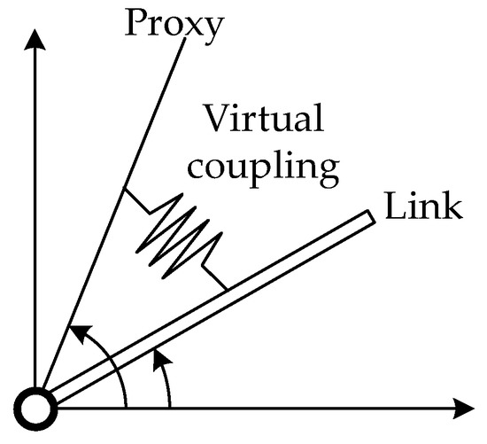 In classical SMC, the “chattering” phenomenon is one important issue that needs to be solve, which is caused by the sign function. So, a virtual object called “proxy” is applied to reduce the phenomenon in the PSMC strategy [36], as illustrated in Figure 4. The proxy connects the physical actuator and the desired position, and one “virtual coupling” connects the proxy with the actuator. The virtual coupling can be seen as an imaginary spring-like element which exerts a specific force to maintain the length to zero. The proxy has the capability to simulate ideal motion, which satisfies idealized physical constraints. A PID controller is usually introduced for the virtual coupling to affect the physical object and reduce the “chattering” to a great extent.