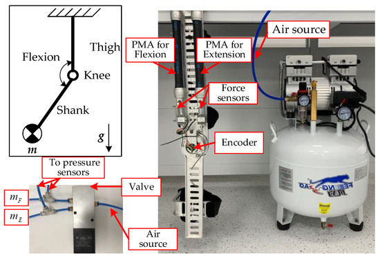 where is the pneumatic mass flow of the PM, R is the universal gas constant, T represents the gas temperature, and , represent volume of the flexion and extension-side PM. V could be modeled as a function of muscle contraction length x and transformed into the form of knee joint . The coefficients , and can be determined experimentally.