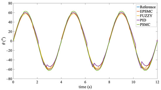The tracking performance for the sinusoidal signal with different control strategies is shown in Figure 7, and the comparison result is shown in Table 3. As is illustrated in Figure 7, around the extreme point of desired trajectory, the tracking trajectories for each control strategy start to fluctuate, which affects the tracking performances. The PSMC and EPSMC can track the desired trajectory better than the other control strategies, but the tracking trajectory of EPSMC is more consistent with desired trajectory. The detailed evaluation with ‘MaxError’ and ‘IntelError’ are calculated in Table 3. The result shows that the EPSMC behaves best since it can reduce the “chattering” phenomenon significantly.