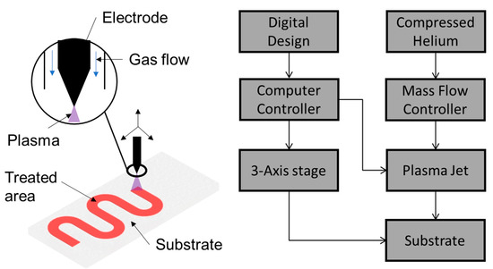 The manufacturing platform that was designed and created in this research is summarised in Figure 1. Plasma was generated using a commercially available plasma jet (Piezobrush PZ2, Reylon Plasma GmbH, Regensburg, Germany) which produced a localised source of the reactive species responsible for the surface modification. This featured a nozzle that guided a gas flow over a high-voltage electrode to generate the plasma.