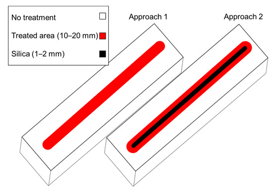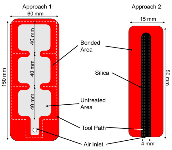 Two different approaches to selective bonding were studied. They were made possible with this apparatus, and are described in Figure 2. These concerned selective surface treatment to encourage areas of bonding (termed Approach 1) or selective surface treatment to prevent areas of bonding (termed Approach 2). This was intended to explore the effectiveness of the bonds created, and to establish if different methods may be more appropriate according to the scale and design of the pneumatic actuator to be created. Approach 1 is similar to that which was undertaken in previous studies [22,23], with the substrates being treated such that sufficient oxygen is chemically added to the surfaces to cause bonding. However, as a localised plasma source was used, selectivity could also be achieved by overtreatment (Approach 2). This approach intentionally treated the Ecoflex surface to form a ceramic silica layer, which other works stipulate to be in the order of 5 nm thickness [24,25], that did not bond to PET. This is possible because a point source of plasma varies in reactive species concentration radially away from its centre, and as a result so does the degree of treatment. Due to this, zones of silica were formed as well as zones of treatment for bonding depending on the exposure level.