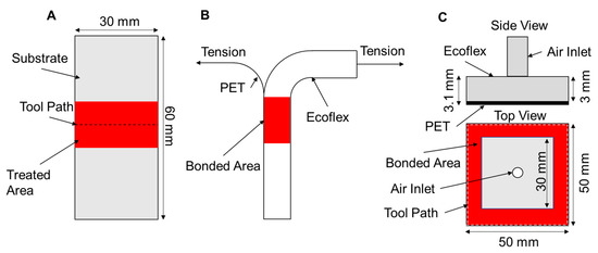 Bonding was carried out between Ecoflex 00-50 (Bentley Advanced Materials, Kidderminster, United Kingdom) and 100 µm thick polyethylene terephthalate (PET) sheets (Write-on transparency film, Office Depot UK Ltd., Leicester, United Kingdom). The difference in the stiffness of the two materials was ideal for creating a bending motion in pneu-net style actuators. First, the Ecoflex parts A and B were mixed in equal weight before being degassed in a centrifugal mixer degasser (ARE-250, Thinky U.S.A Inc., Laguna Hills, CA, USA). Once degassed, the elastomer was poured into a mould and degassed again under vacuum of 0.02 bar for 2 min. Finally, it was cured at 45 °C for 30 min. The PET sheets were then treated using the selective plasma treatment platform according to the desired pattern and then submerged in a 1% concentration solution of 3-aminopropyltriethoxysilane (APTES, Merck Life Science UK Ltd., Gillingham, United Kingdom) for 20 min before being removed and dried with compressed air ready for bonding. While the PET was in the APTES solution, the Ecoflex layer was plasma treated with a corresponding pattern. Once treatment was complete, the dried PET and treated Ecoflex were aligned and placed in contact manually; no additional equipment was used to align layers or apply pressure. Some degree of bonding took place instantaneously, but for the bonding to complete, the samples were left at room temperature for 2 h. Care was taken throughout the process to prevent surface contamination that could have interfered with treatment or bonding. This procedure was used for all samples.