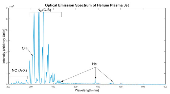 The emissions from the plasma discharge were dominated by nitrogen and hydroxyl species, as can be seen in Figure 5. The emissions from 200−300 nm indicate that NO was formed [26], while the various peaks from 300−450 show that N2 transitions occurred [27]. The peak at 308 nm confirms OH species were present. The peaks at 477.1 nm, 587 nm and 667 nm show that helium transitions [27] took place. It is clear from this spectrum that, although only He was supplied to the plasma jet, various species were subsequently created due to the interactions with atmospheric air. It is important to note that no emissions were detected at 777 nm or 844 nm, which would indicate the presence of atomic oxygen [27].