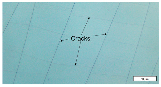 This shows that, despite the nitrogen-dominated discharge, the oxygen content increased with treatment time, whereas the carbon content decreased. This is likely due to downstream interactions that created reactive oxygen species and this trend correlates with those reported elsewhere [28]. This confirmed that plasma treatment was appropriate for the bonding as no nitrogen was detected on the surfaces that would have interfered with the bonding. Notably, at a treatment time of 0.5 s, the carbon content increased by 2.53% and the silicon content decreased by 2.73%, which opposes the trend of the rest of the data and the secondary data available in the literature, and as such this is unlikely to be a result of the plasma treatment. These results were intended to be purely qualitative as the spatial resolution for the XPS analysis was too low compared to that of the treatment to calculate concentrations of oxygen across the treated surface or draw any further conclusions about the relationship between treatment time and oxygen content. At a treatment time of 1.5 s, there was a prominent change in the Si:C ratio, which indicates overtreatment and silica formation. This was confirmed by inspection under a microscope, where clear cracking of the surface can be seen in Figure 6. No silica formation was observed under microscope inspection for either a 0.5 s or 1 s treatment time.