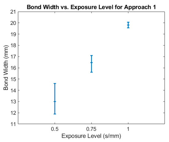 The bond uniformity data gathered from the samples described in Section 2.4 (Figure 3A) are presented in Figure 7. They show that the process was inconsistent for treatment levels 0.5 s/mm and 0.75 s/mm with bond widths ranging from 11.9 mm to 14.6 mm and from 15.6 mm to17.6 mm, respectively. For pneumatic soft actuators, this level of variation would be unacceptable as it would lead to unintended deformation when inflated. At a treatment level of 1 s/mm, however, this range was improved to 19.8−20.4 mm. When designing a pneumatic actuator to be fabricated using this method, this situation must be considered. For example, if an actuator with a target chamber width of 4 mm was fabricated using the approach, then the resulting chamber would vary in width between 3.4 and 4.6 mm. This would produce actuation behaviour different from that which the actuator was designed for. Therefore, this approach is only suitable for large actuators where the impact of the variability is minimized.