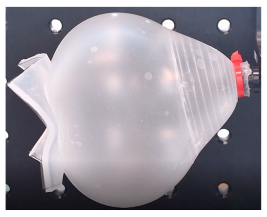 In the 180° peel tests, all samples from every treatment level underwent failure in their Ecoflex layer, not at the bond suggesting suitable bond strength for pneumatic soft actuators. This was then further corroborated by inflating the chambers described in Section 2.4. (Figure 3C), made using a 1 s/mm treatment level. All samples inflated failed in the Ecoflex layer at pressures ranging from 34 to 36 kPa. An example of one of these samples just prior to bursting can be seen in Figure 8. While this confirms that the strength of the bond is suitable to operate pneumatic soft actuators, it does not address any fatigue failure mechanisms that may be incurred through repeated cycling of the actuators, which requires further study. This will need to be studied as part of a further process and device development.