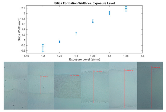 Measured width of silica formation at 6 exposure levels with examples of each.