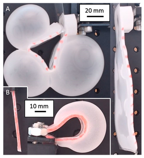 The actuators fabricated using Approach 1 can be seen in Figure 10A, whereas the actuator fabricated using Approach 2 is in Figure 10B. Approach 1 used an exposure level of 1s/mm, and Approach 2 used 1.25 s/mm as these showed the lowest dimension variation, as discussed in Section 3.2. The large actuator was inflated to 16 kPa, whereas the small actuator was inflated to 63 kPa. Neither actuator failed, but plastic deformation in the Ecoflex layer was observed once deflated for both, suggesting that each was approaching failure. It can be seen in Figure 10A that each chamber did not inflate equally. This was a result of the dimensional variation of the bonding approach. The small actuator showed a more even inflation across its single chamber, which further highlights the more uniform bonding of Approach 2. Both actuators were capable of large deformations limited by collision with the clamps in which they were mounted.