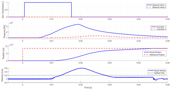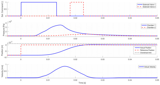 Minimizing the shift time is crucial, as the longer the gear shift takes, the longer the power flow is interrupted, which affects negatively both passenger comfort and vehicle dynamics. Assuming a manual transmission, a gear shift takes approximately 0.5–1 s for an average human driver. The shift consists of the clutch’s disengagement, the gear shifting with synchronization, and the clutch’s engagement. Most of this time is needed for the operation of the clutch, hence the shift time must be under 80–100 ms. Ideally, there would be no collision between the cylinder housing and the piston, however, as the system is only stable in its fixed positions, hitting the end positions is unavoidable while switching to High or Low. Hence, the collision speed and the kinetic energy at the moment of collision must be minimized to prevent the damaging of the system. To determine the limit of the impact velocity, in most cases finite-element modeling and lifetime calculations are used. The limit of the overshoot is a safety-critical requirement, as accidental gear changes caused by overshoot must be avoided to ensure safe operation. Since the actuator shall operate on different gearboxes, the exact positions of the gears are not known, hence the strict limitation is reasonable. The number of the maximum valve activations is a less strict criterion, and a slight excess of this limit can be tolerated, but it excludes widely used methods, such as PWM. It is calculated from the valve switches guaranteed for the valve’s lifetime, the actuator’s expected lifetime, and the assumed number of gear changes during the lifetime of the system. The ECU limits the maximum control frequency as further reducing the sample time could cause malfunction because the tasks could overlap as the ECU cannot finish the calculations before the start of the next step.