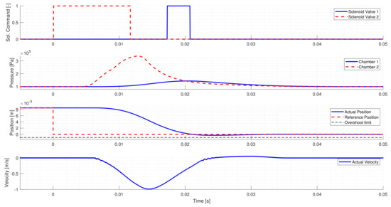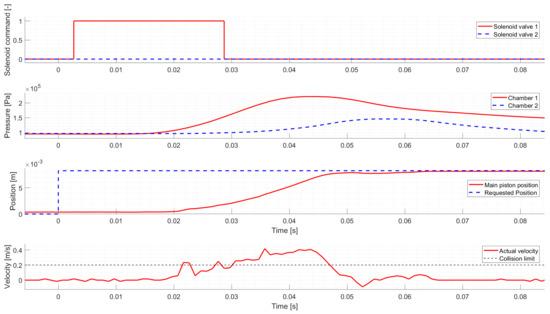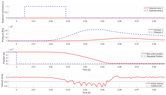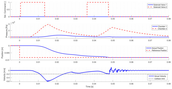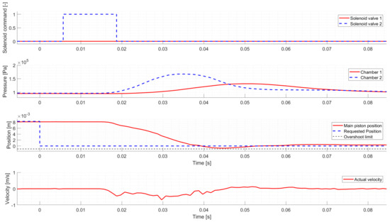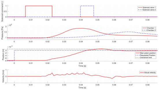 Figure 6 shows a Neutral to Low gear change. Similarly to the first test case, the controller activates the proper solenoid valve to shift the actuator to the requested gear. However, the initial solenoid valve command is too short, and the piston’s movement slows down too early. Hence the controller intervenes and applies a second valve command to ensure that the request is reached. Around 0.278 s, a break-point can be seen in the piston’s velocity, where the piston starts to accelerate, which is not caused by the chamber pressures. The reason for this sudden change is the arrest mechanism, which tries to return the piston to Neutral at the first part of the gear change, but after passing through the break-point, the direction of its force changes, and it tries to move the piston to Low instead.