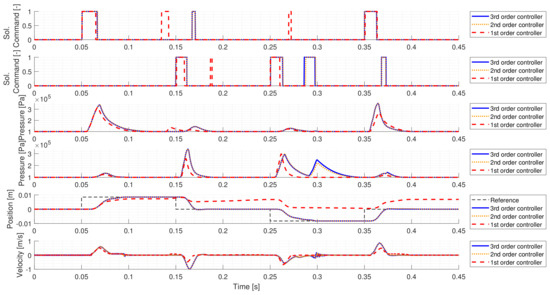 In industrial applications, resource management is an important aspect, as the calculation cost and memory usage of a controller affects the product’s cost. Hence, to find a trade-off between the control’s accuracy and its complexity, simplification possibilities must be considered. To reduce the controller order, a balanced truncation model order reduction has been performed on the controller. The reduced model is obtained by truncating the required number of states, which contribute least to its input-output mapping. Figure 8 shows the comparison of the original (third-order) controller, and two reduced-order controllers. The second-order controller still has almost identical performance to the original controller, but further decreasing the controller’s order results in significantly worse performance.