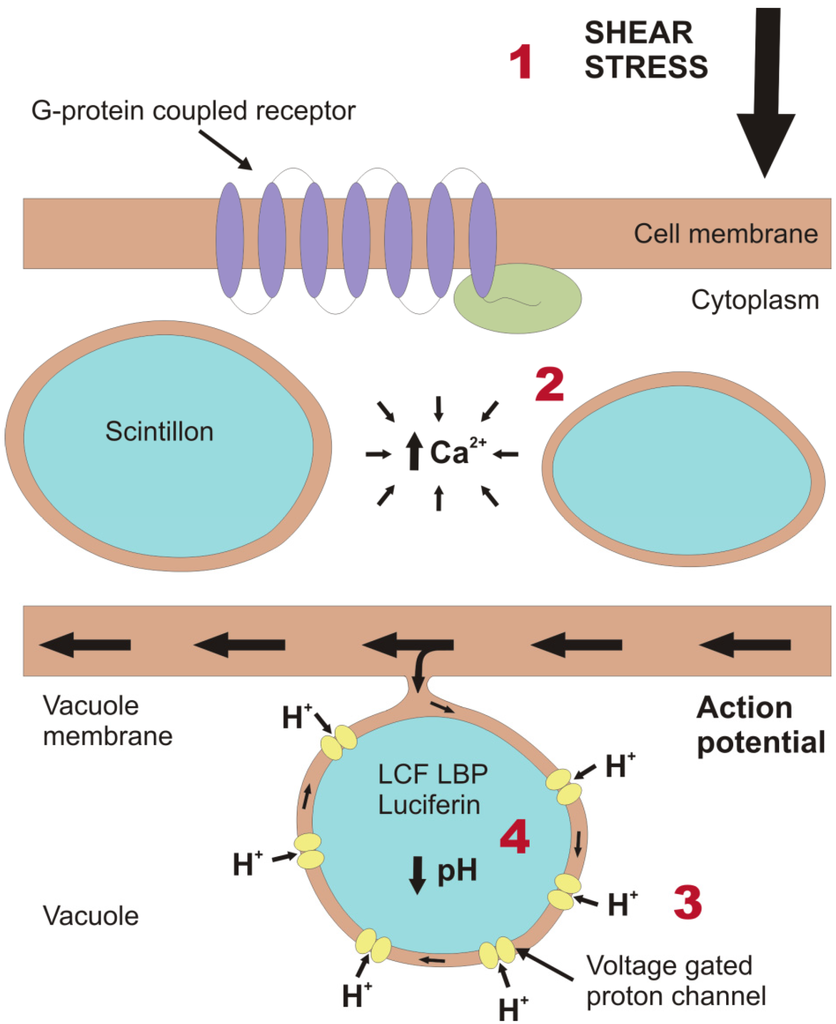 A cascade of cellular processes mediates bioluminescence, from sensing a stimulus to the production of light (Figure 1). The chemical reaction to produce light is pH dependent, requiring the acidification of scintillons. For this reason, some scintillons protrude into the acidic vacuole. The shear stress exerted on the cell membrane triggers a mechanotransduction pathway to generate an action potential across the vacuole membrane and the associated scintillons. Chen et al. [] provided evidence that this cascade involves the activation of GTP-binding protein coupled receptors in the plasma membrane. It is, however, unknown at which stage these receptors are activated. They areunlikely to be primary sensors as the fastest G-protein signaling pathway known to date has a longer latency time than the whole transduction process in dinoflagellates []. Experiments by von Dassow and Latz [] conducted using various ionic inhibitors showed that, after sensing the mechanical disturbance, the next step of the process is mediated by an increase in cytosolic Ca2+, mainly by release from intracellular stores and partially from extracellular sources. The action potential produced by these processes leads to an influx of protons from the acidic vacuole into the scintillons, decreasing their internal pH from ~8 to ~6 [].