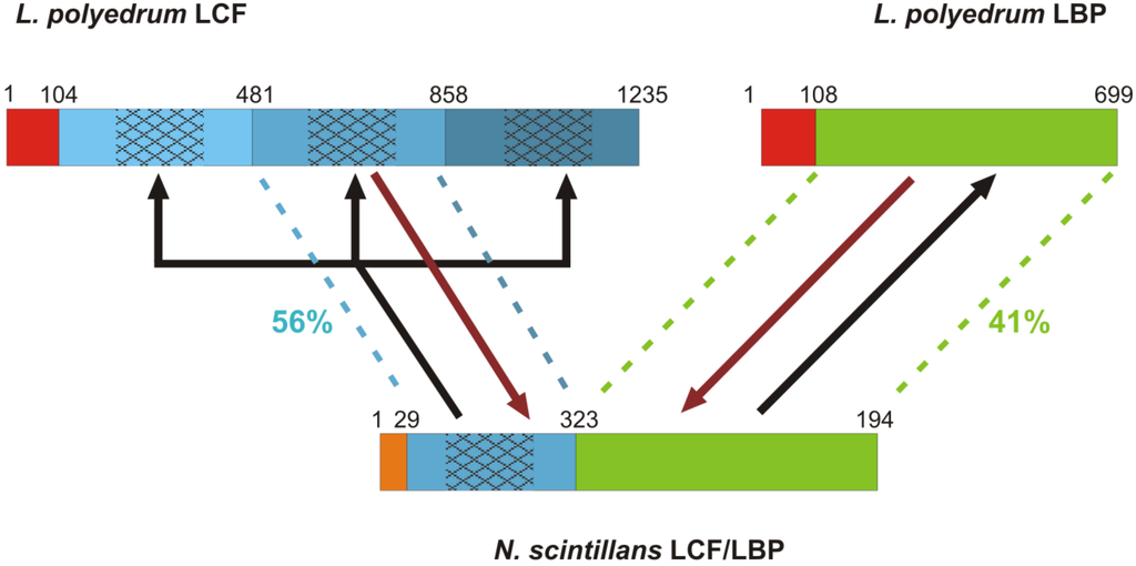 A schematic representation of the different LCF and LBP structures labeled with amino acid positions and the two scenarios for their evolution [,]. Lingulodinium polyedrum LCF represents the photosynthetic dinoflagellates in general []. The three non-identical repeat domains of L. polyedrum LCF (different shades of blue) are each 377 amino acids long with 150 amino acids in the central regions that encode the catalytic sites (patterned) and retain higher sequence similarity. The single LCF domain of N. scintillans is most similar to the second domain of L. polyedrum LCF. The LBP domain in N. scintillans is structurally equivalent to that in L. polyedrum, both consisting of four repeat domains. In both organisms, LCF is preceded by an N-terminal gene region which is similar in the LCF and LBP of L. polyedrum (red) but not in N. scintillans (orange). Two potential scenarios of how these gene structures arose are shown. In the gene fission scenario (black line), the N. scintillans gene split and the LCF domain underwent successive duplications. In the gene fusion scenario (brown lines), the second domain of LCF was excised (e.g., by splicing) and fused with LBP in N. scintillans.