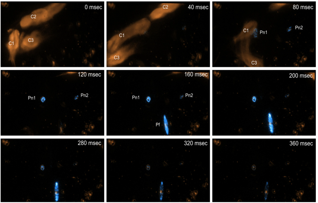 Image sequence from a video of bioluminescent dinoflagellates flashing in response to stimulation by copepods. The time from the beginning of the image sequence is indicated on each frame. Three copepods (C1–C3) collide and rapidly swim away from each other. During these fast swimming bursts, the dinoflagellates are stimulated to bioluminesce, although it is not possible to discern whether this is due to the copepod swimming current or to direct contact. Bioluminescence is seen to develop and diminish in the scintillons of two cells of Pyrocystis noctiluca (Pn) and a Pyrocystis fusiformis (Pf), which is pulled into the field of view at 160 ms by the copepod swimming current. The video was filmed by Ammonite Films at the National Oceanography Centre—Southampton. Filming was done under an inverted microscope at 10× magnification. The outline was captured using infrared light and bioluminescence was captured by a blue sensitive camera.