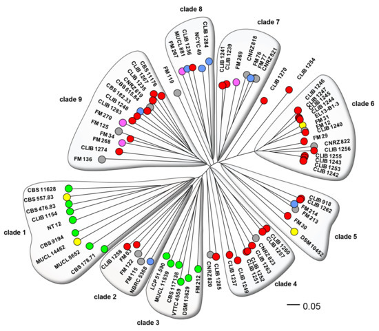 The five isolated strains (CLIB 1254, CLIB 1270, CLIB 1285, CNRZ 820, and FM 119) outside of the defined clades may represent poorly sampled clades. They might otherwise contain genetic material from two different sources, intermediate strains as seen in Saccharomyces cerevisiae [11,34]. Investigation showed that, excepting strain CLIB 1254 which harbored rare alleles at four of the twelve loci, these strains indeed contained mostly a mixture of alleles from the adjacent clades (Table S3).