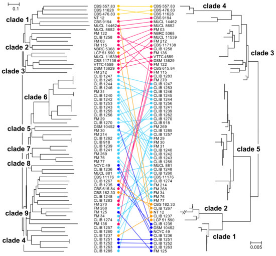 Comparison of NJ trees obtained by analysis of the microsatellite-like loci and MLST analyses of the G. candidum strains. Left, microsatellite analysis; right MLST analysis [9]. Taxon order was optimized manually using “Mega X” and strains that were not common to the two studies were removed. Connectors are coloured with respect to the MLST clades: dark blue, clade 1; orange, clade 2; pink, clade 3; yellow, clade 4; turquoise, clade 5.