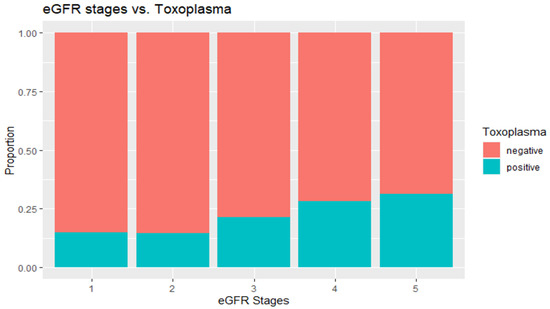 Table 2 presents the associations between T. gondii IgG status and CKD biomarkers without accounting for any covariates. The design-based t-test or Rho-Scott chi-square was used to assess the significance of these associations. The results indicated that there was statistically significant associations between the T. gondii status and each of second albumin-to-creatinine ratio (p = 0.0376), second albuminuria (p = 0.0005), persistent albuminuria (p < 0.0001), CKD status (p = 0.0001), and CKD stages (p = 0.0004). The highest proportion of T. gondii-positive patients occurred in stage 4, while the mean of eGFR was lower among the T. gondii-positive participants, but it was not statistically significant (p = 0.0913). However, the level of eGFR was significantly different among positive and negative participants (p = 0.0014). The elevated level of eGFR (stages 4 and 5) had higher proportions of positive participants than the negative participants (Figure 1). Furthermore, there was a statistically significant association between the T. gondii status and CKD levels with higher proportions of mild and moderate-to-severe levels of CKD among the positive participants when compared to the negative participants (p < 0.0001).