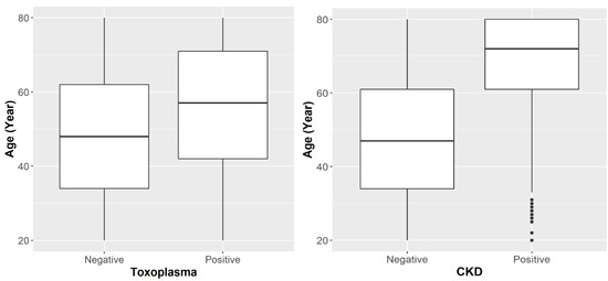 Prior CKD and Toxoplasma studies in the USA population suggest that the prevalence of CKD or Toxoplasma is associated with age [1,27]. In this study, the participants with positive Toxoplasma or CKD were significantly older than the negative participants (p < 0.0001, Figure 2). This significant association between age and each of CKD and Toxoplasma indicated that age might serve as a confounding factor in the association between CKD and Toxoplasma. This observation was supported by the age-stratified analysis. After age adjustments, the prevalence of CKD was higher among Toxoplasma-positive participants compared to the Toxoplasma-negative participants (10.45 vs. 8.99, Figure 3).